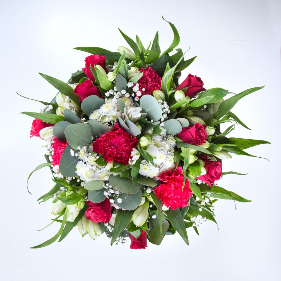 Embrace the timeless beauty of our unique bouquet, designed to enchant and inspire. Combining luxurious red roses with sweet white chrysanthemums and airy gypsophila, enriched by white alstroemeria and elegant aspidistra foliage.