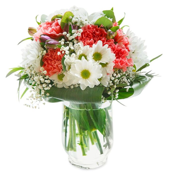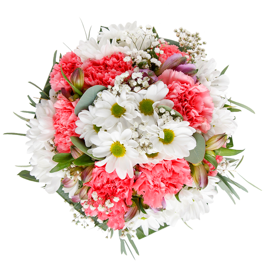 Experience the charm of our meticulously crafted arrangement, designed to bring joy and beauty to any occasion. This unique bouquet features a harmonious blend of snow-white chrysanthemums, delicate gypsophila, and soft pink carnations, gracefully wrapped in lush aspidistra leaves.